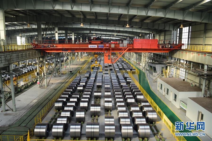 无人吊车在包钢集团稀土钢板材厂冷轧轧后库夹取钢卷(11月7日摄)。新华社发(李志鹏 摄)