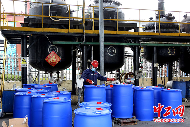 (图4为)2月27日,山东省枣庄市东涛化工技术有限公司的工人在车间生产出口化工产品。