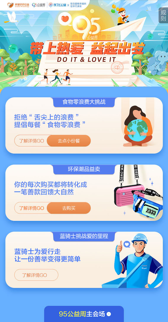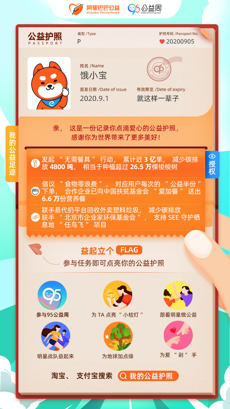 据了解,本次“95公益周”,阿里经济体将再次集结社会力量,围绕“带上热爱,益起出发”的主题,开启多场景、多人群、线上线下结合多端联动的全民公益狂欢。即日起登录饿了么APP搜索“95公益周”,便可领取专属公益护照,开启公益之旅。