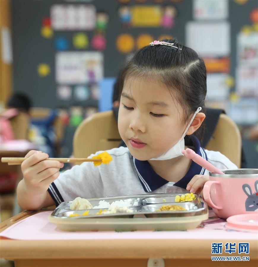 9月2日,上海市长宁区天山第一小学的学生在吃午餐。 新学期到来,上海市长宁区天山第一小学把“光盘行动”与爱惜粮食主题教育结合起来,引导学生养成良好的用餐习惯。 新华社记者 丁汀 摄