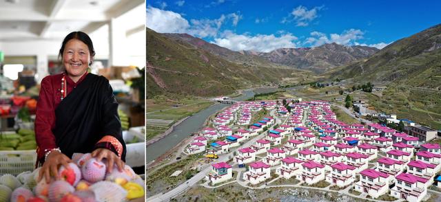 拼版照片:左图为西藏昌都市丁青县尺牍镇巴登村村民强珍在尺牍镇农贸市场自己的摊位前(2020年9月18日摄);右图为尺牍镇易地扶贫搬迁安置点一角(2020年9月18日摄,无人机照片)。新华社记者 詹彦 摄