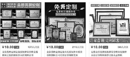 “你需要给我提供准备制作的文字、标志,有图案也可以。具体获奖的内容和落款单位,我们包设计,不满意可以修改。”该店员表示,而当询问是否可以随意填写奖项内容时,店家则表示自己对此不负责。“我们就管给你做牌子,后续会不会被查,这个我们可不负责。”