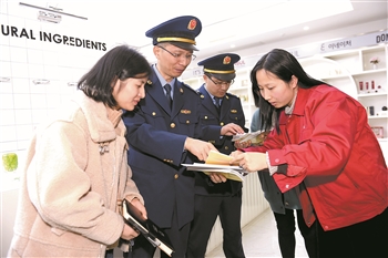 12月10日,化妆品行业监管所工作人员(左二、左三)联合埭溪镇企业服务专员(左一)组成化妆品企业服务专班,到化妆品企业上门开展走访服务。