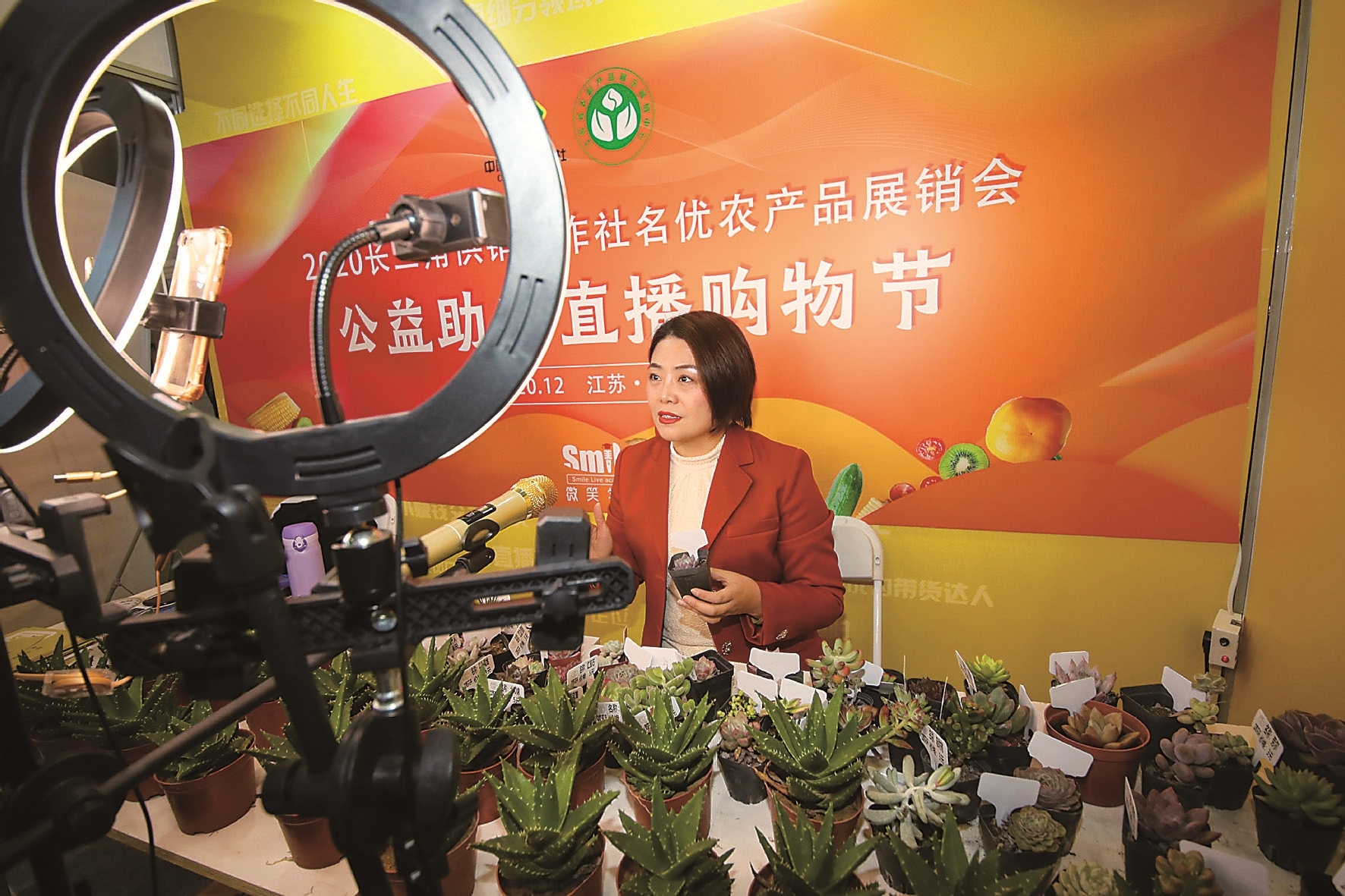 12日,2020长三角供销合作社名优农产品展销会在南京国际博览中心举行。图为直播带货。 新华日报通讯员 刘国华 新华日报记者 陈 俨摄