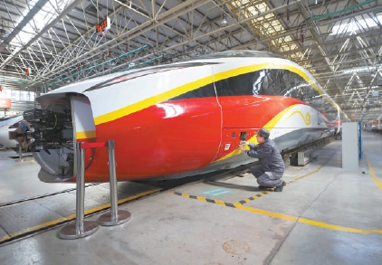 12月4日,中车唐山公司员工对列车进行检测。日前,我国时速400公里跨国互联互通高速动车组在位于河北省唐山市丰润区的中车唐山公司下线。 新华社记者 邢广利摄