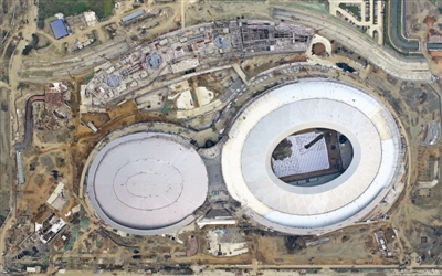 从空中来看,整个建筑好似四川的盖碗茶,足球场是茶碗,体育馆是茶盖,下部的大平台是茶托。不仅如此,足球场最高处还创新性地加设了一个空中俱乐部——天府俱乐部,把球场和1.8万座席的体育馆连接成一个整体,可以同时观看足球场以及体育馆内部。