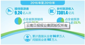 2016年至2019年,云南省乡村旅游共接待旅游者9.24亿人次,占全省旅游接待人次的39.3%;乡村旅游收入7301.4亿元,占全省旅游收入的23.7%。