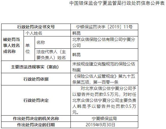 银保监会网站今日公布的中国银保监会宁夏监管局行政处罚信息公开表(宁银保监罚决字〔2019〕11号)显示,北京众信保险公估有限公司宁夏分公司存在未按规定建立完整规范的保险公估档案的违法违规行为,韩昆为相关责任人。根据《保险公估人监管规定》第九十五条第五项,第一百零一条,宁夏银保监局对北京众信公估宁夏分公司予以警告并处罚款0.5万元,对时任北京众信公估宁夏分公司主要负责人韩昆予以警告并处罚款0.5万元。