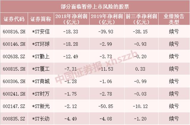 在尚未发布年报预告或年报预告不确定的公司中,有23家*ST公司此前连续两年亏损且三季报亏损超过1亿元。此外,有21家*ST公司2019年净资产为负且今年前三季度净资产为负。这些公司如果四季度不能改善,也可能面临暂停上市风险。