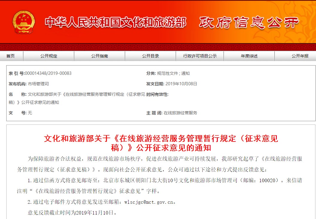 文旅部发布公开征求意见通知 来源:文化和旅游部官网