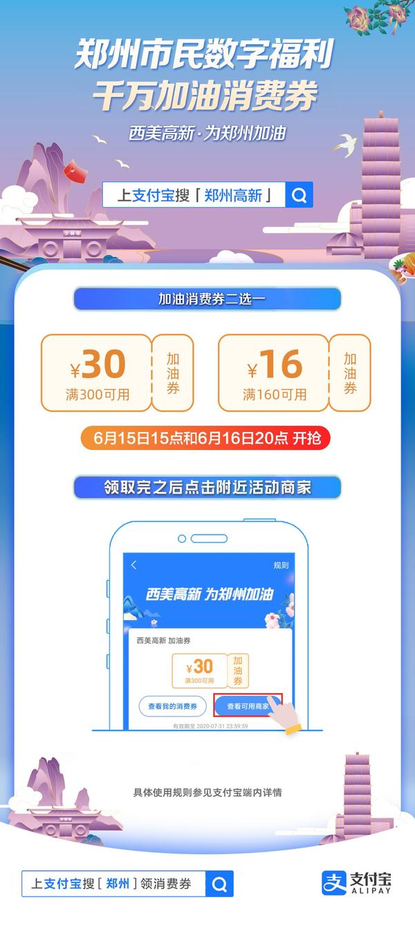 本次加油消费券将分两次发放,发放对象为全体在郑人员(包括域外来郑人员)。6月15日15:00和6月16日20:00,消费者均可通过支付宝首页或搜索“郑州高新”进入“西美高新·为郑州加油”活动页面领取消费券,市民也可以通过“郑好办”App首页进行申领。