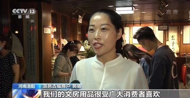 洛邑古城商户 郭娜:现在游客是越来越多了,我们的文房用品很受广大消费者喜欢。现在比着3月份,销售额翻了一番。