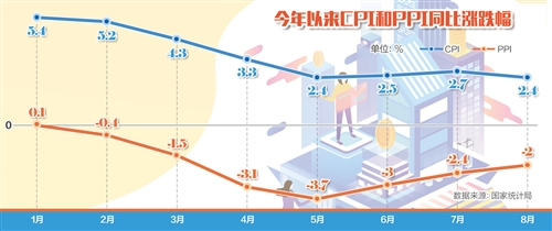 9月9日,国家统计局发布的数据显示,8月份全国居民消费价格指数(CPI)同比上涨2.4%,涨幅比上月回落0.3个百分点;工业生产者出厂价格指数(PPI)同比下降2.0%,降幅比上月收窄0.4个百分点。