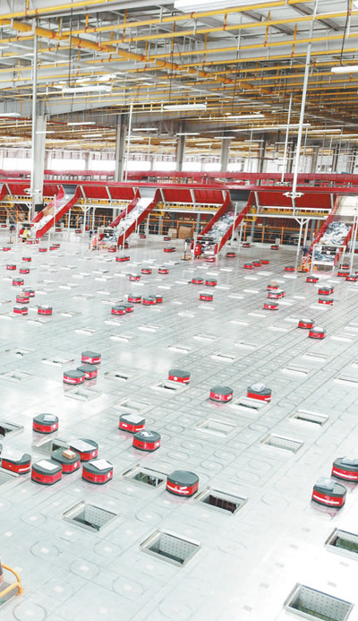 在湖北武汉市的某电商平台物流仓内,智能分拣机器人正有条不紊地分拣快递。