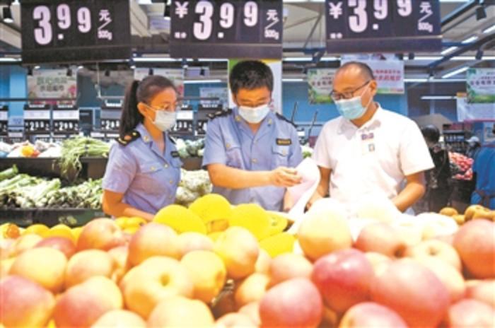 9月29日,廊坊市安次区市场监督管理局工作人员在一家超市检查水果溯源情况。