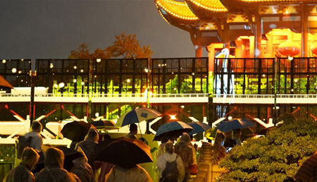 “深夜三更人寂静,击掌为号桂花亭……”入夜,正是淮安里运河畔最热闹的时候,河畔传来阵阵悠扬婉转的吟唱声。一出经典的淮海戏剧目《皮秀英四告》正在大戏台上演,台下两三百名戏迷听得入神。在运河北岸,国庆长假期间依次呈现的旗袍秀、相声、黄梅戏等文化惠民节目正在不停顿彩排,台下观众反响热烈。运河南岸,古老的国师塔沐浴月色,岸边游客们正排队等待乘坐画舫游船,准备在碧波中体验不一样的运河风情。