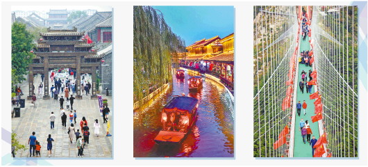 左:10月1日,游客在无棣县古城景区观光。 中:10月2日,游客乘船在台儿庄古城景区夜游。 右:10月5日,游客在沂蒙山银座天蒙旅游区游览。(初宝瑞 高启民 武纪全 摄)