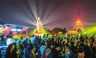 “十一”长假期间,众多游客在大唐不夜城景区游玩。 (记者 张宇明 摄)