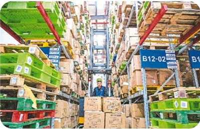 图为11月4日,工作人员使用高位拣选车在VAN窄巷道高位货架上进行存储货物的操作。