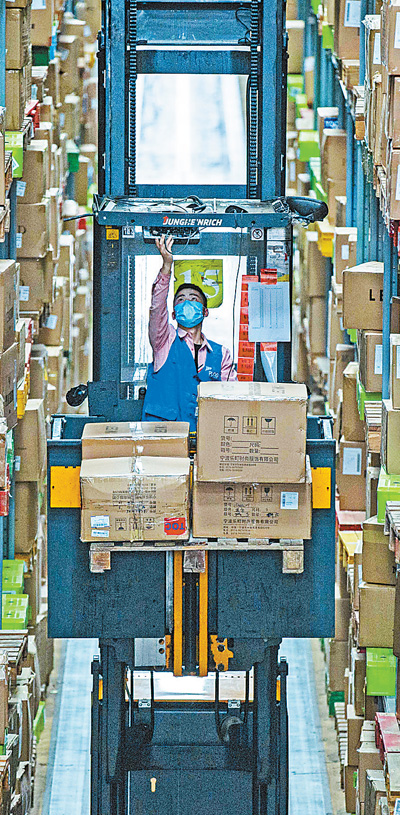 11月4日,在浙江省慈溪市滨海经济开发区的一家物流中心里,工作人员使用高位拣选车在窄巷道高位货架上存储货物。