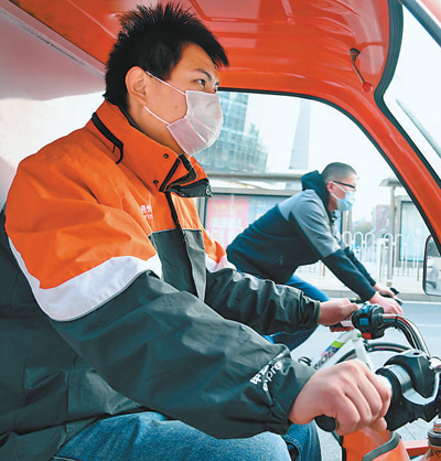 11月11日,在北京市海淀区中关村大街,快递员驾驶快递车运送快件。
