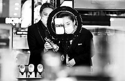 在河北省石家庄市北国商城化妆品柜台,工作人员进行直播。新华社发