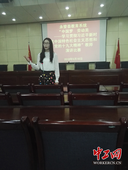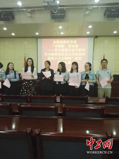 中工网讯 为深入学习贯彻习近平新时代中国特色社会主义思想和党的十九大精神,弘扬劳动精神,营造劳动光荣、劳动伟大、劳动美丽的社会氛围,5月16日,甘肃永登县总工会、永登县教育局工会联合在全县教育系统举办“中国梦劳动美”学习习近平新时代中国特色社会主义思想和党的十九大精神演讲比赛。
