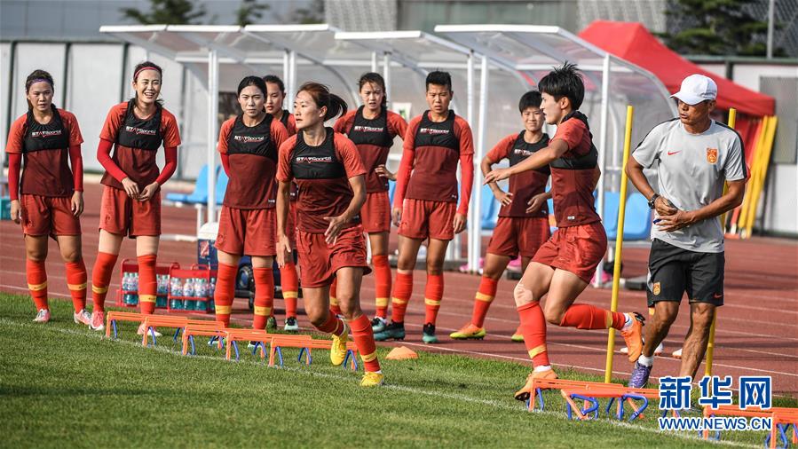 8月6日,中国女足队员吴海燕(中)在训练中。新华社记者潘昱龙摄