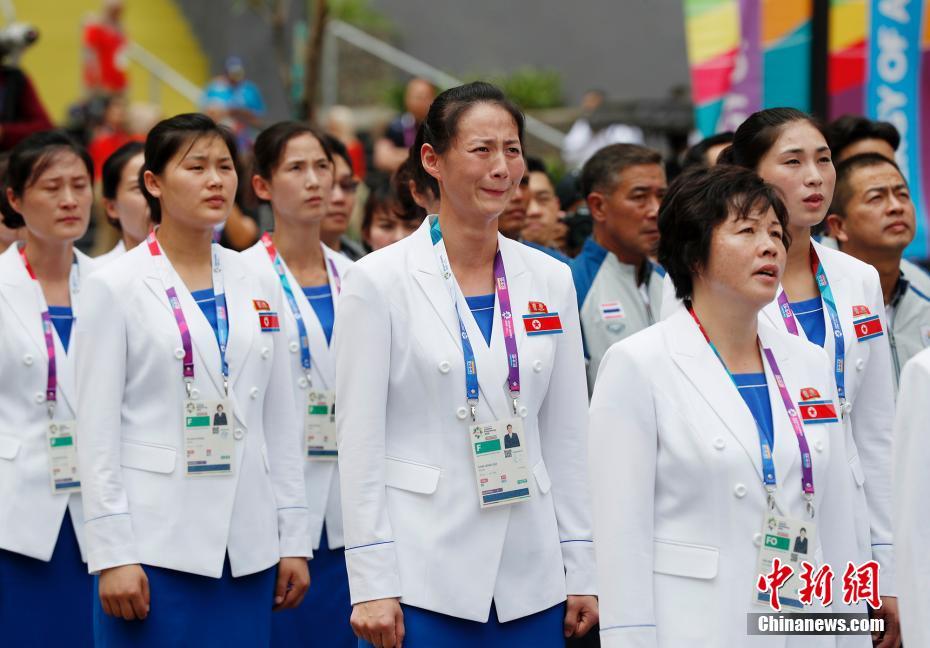 8月16日,朝鲜代表团在印尼雅加达亚运村举行升旗仪式。当朝鲜国歌响起时,朝鲜女运动员纷纷落泪。中新社记者 刘关关 摄