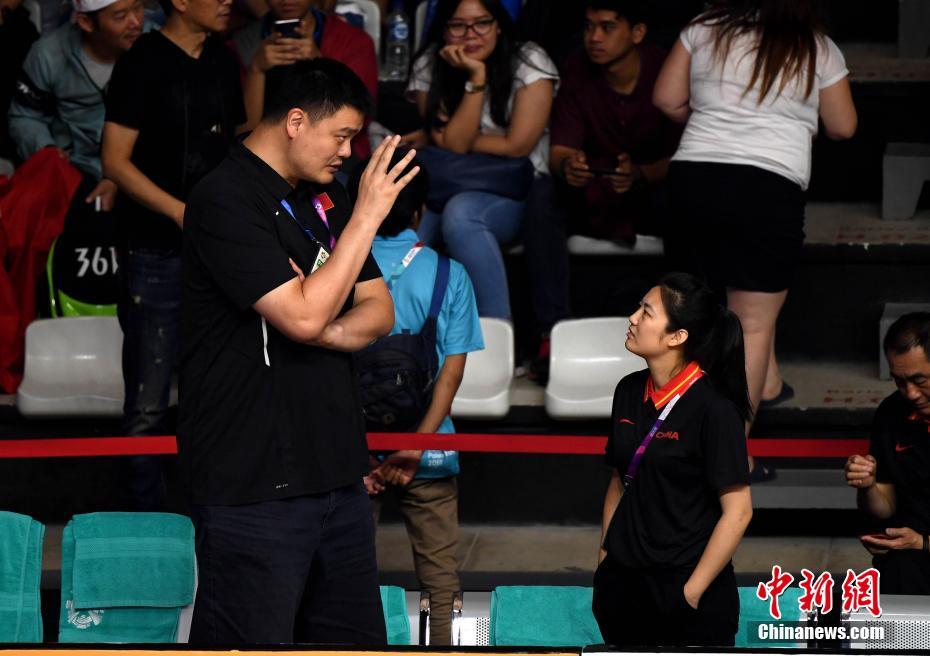 8月17日,姚明亮相雅加达亚运会篮球比赛现场。当日,中国女篮在小组赛上以105比73大胜日本女篮。 中新社记者 王东明 摄