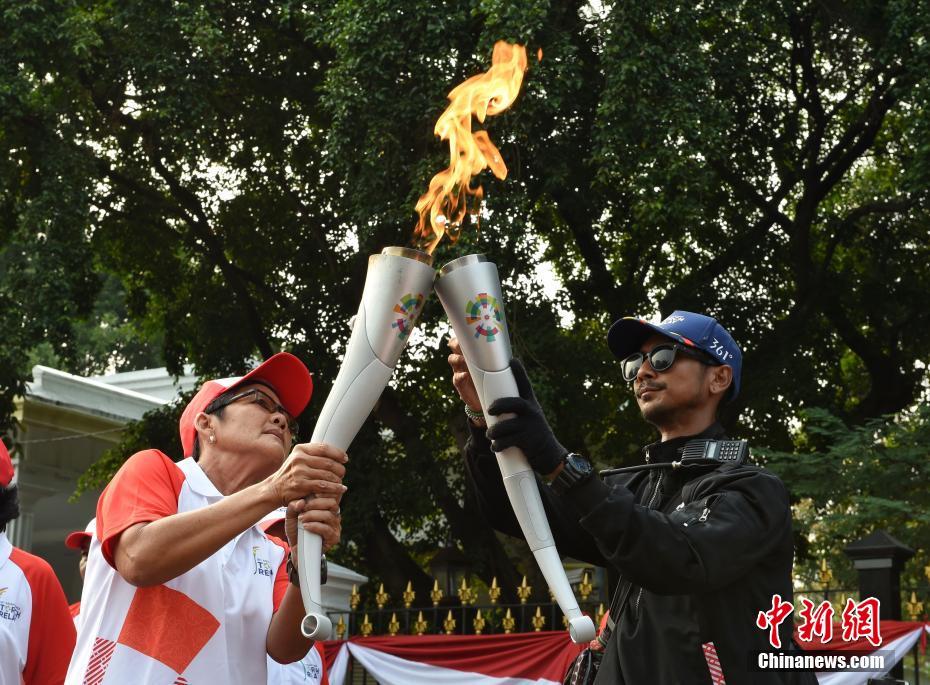 8月17日,第十八届亚运会火炬接力活动进入倒数第二天,亚运火炬当天在印尼首都雅加达的独立广场及总统府周边等地进行传递。 中新社记者 李霈韵 摄
