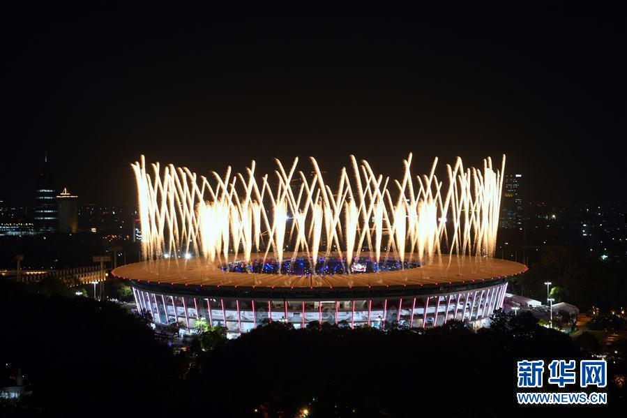↑8月18日,第18届亚运会开幕式在印度尼西亚雅加达举行。 这是开幕式烟花(8月18日摄)。新华社记者黄宗治摄