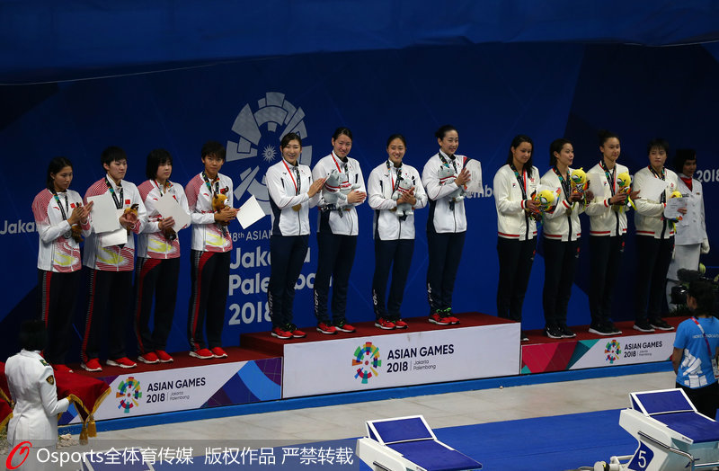 人民网北京8月20日电(李乃妍 实习生余冰玥) 北京时间8月19日晚,2018雅加达亚运会游泳项目结束了女子4100米自由泳接力的争夺,中国队以3分36秒78夺得亚军,日本队以3分36秒52的成绩夺得了该项目的冠军,同时打破了赛会纪录。(Osports全体育传媒专供人民体育 版权作品 严禁转载)