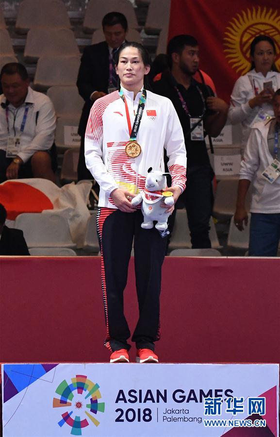 8月21日,中国选手周凤在颁奖仪式上。 当日,在第18届亚运会摔跤女子自由式68公斤级比赛中,中国选手周凤夺冠。 新华社记者李贺摄