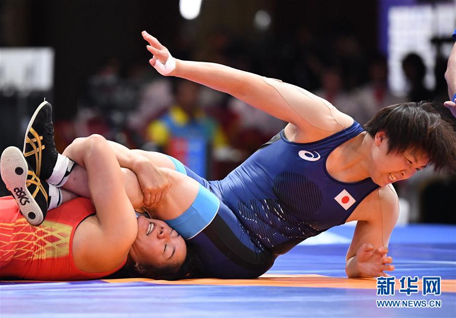 8月21日,中国选手周倩(下)在比赛中。 当日,在第18届亚运会摔跤女子自由式76公斤级决赛中,中国选手周倩以8比0战胜日本选手皆川博惠,获得金牌。 新华社记者李贺摄