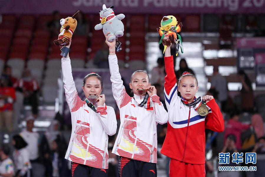 8月21日,中国选手陈一乐(中)、罗欢(左)与朝鲜选手金水晶在女子个人全能颁奖仪式中展示奖牌。 当日,在印度尼西亚雅加达举行的第18届亚运会体操女子资格赛暨个人全能决赛中,中国选手陈一乐获得冠军,罗欢获得亚军,朝鲜选手获得季军。 新华社记者朱炜摄