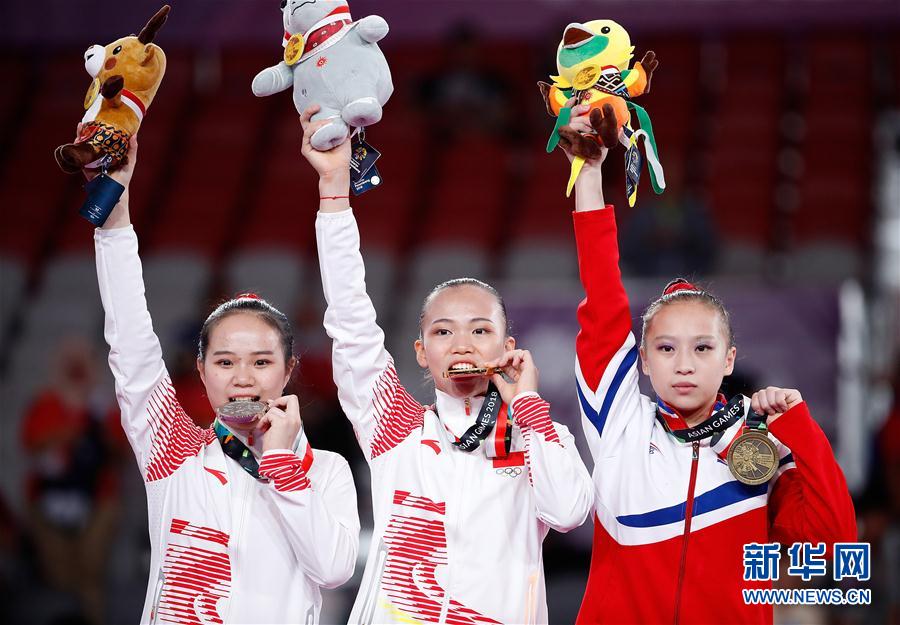 8月21日,中国选手陈一乐(中)、罗欢(左)与朝鲜选手金水晶在女子个人全能颁奖仪式中展示奖牌。 当日,在印度尼西亚雅加达举行的第18届亚运会体操女子资格赛暨个人全能决赛中,中国选手陈一乐获得冠军,罗欢获得亚军,朝鲜选手获得季军。 新华社记者王丽莉摄