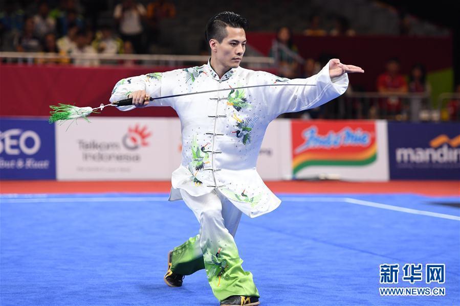 ↑8月22日,中国选手陈洲理在男子太极剑比赛中。 当日,在第18届亚运会武术男子太极拳太极剑全能比赛中,中国选手陈洲理获得冠军。 新华社记者张金加摄