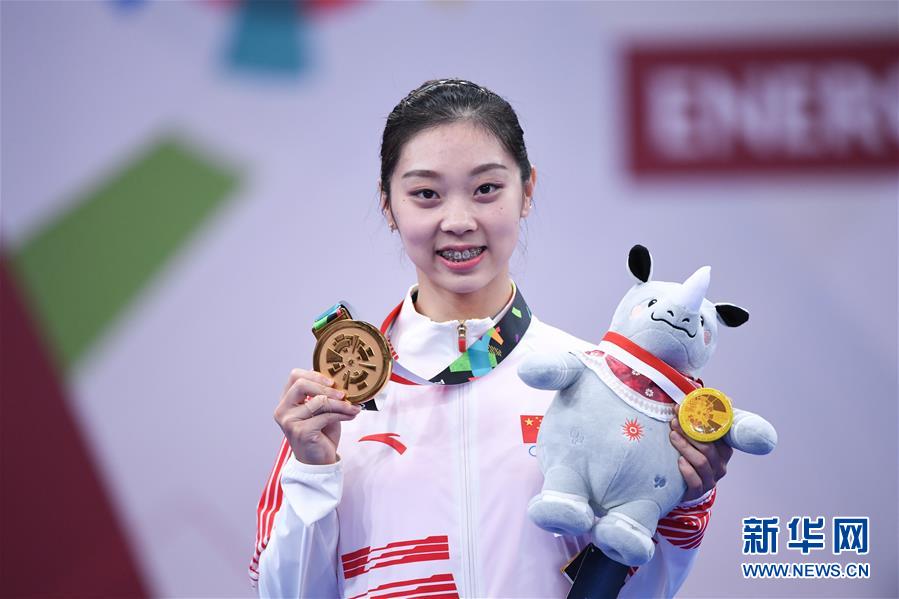 ↑8月22日,中国选手戚昕舣在颁奖仪式上。 当日,在第18届亚运会武术女子长拳决赛中,中国选手戚昕舣以9.74分的成绩获得冠军。 新华社记者张金加摄