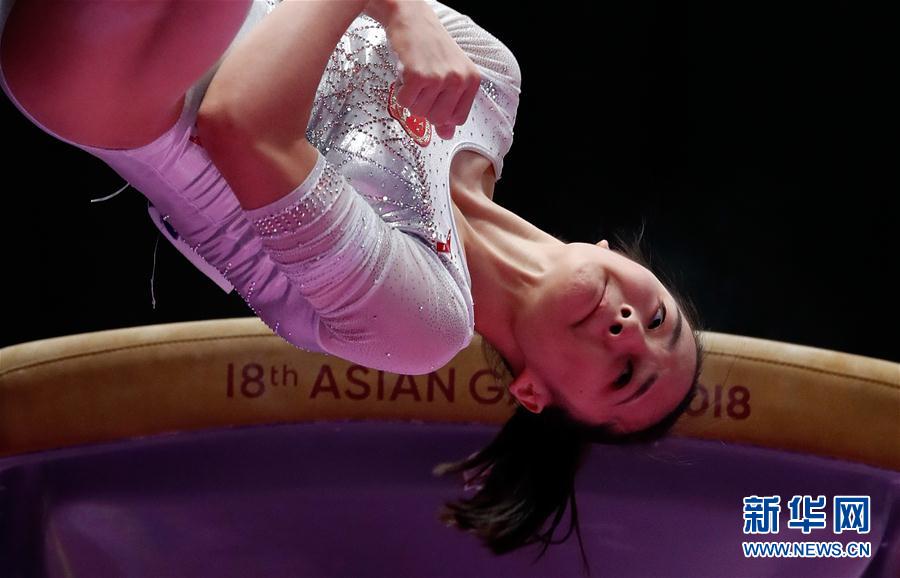 8月22日,中国队选手刘津茹在女团跳马比赛中。 当日,在印度尼西亚雅加达举行的第18届亚运会体操女子团体决赛中,中国队以165.250分的总成绩获得冠军。 新华社记者王丽莉摄
