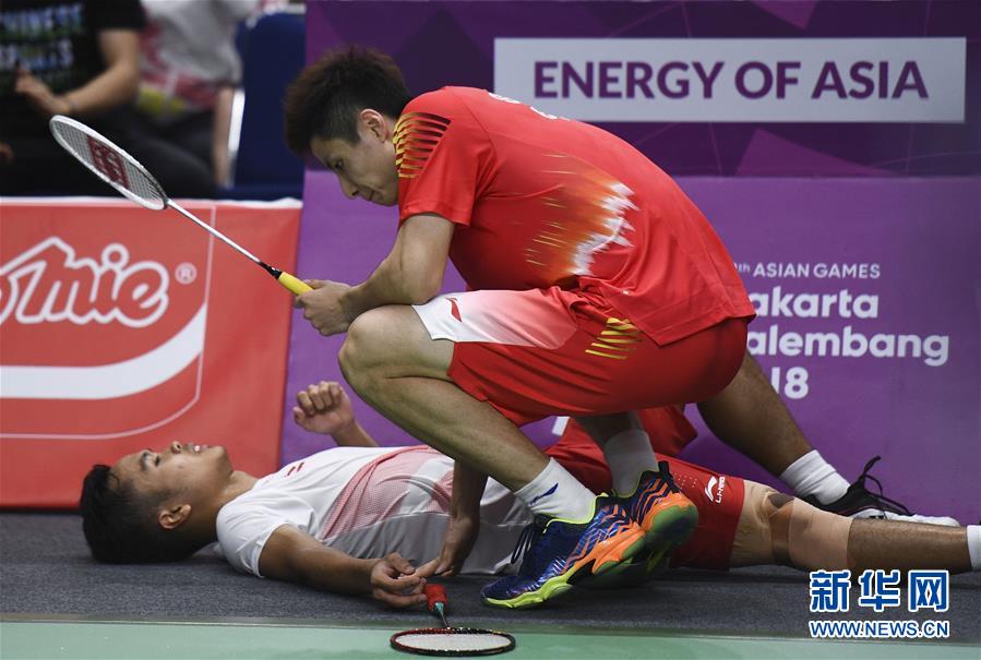 8月22日,中国队球员石宇奇(前)和印尼队球员克里斯蒂·约纳坦在比赛后。 当日,在第18届亚运会羽毛球男子团体决赛中,中国队迎战印度尼西亚队。 新华社记者李响摄