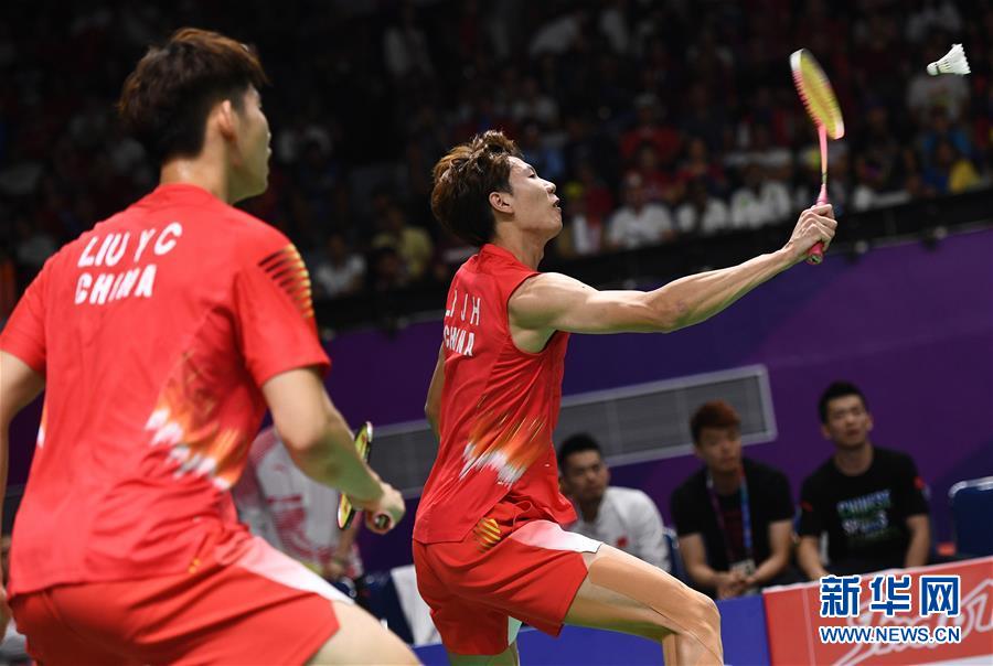 8月22日,中国队球员刘雨辰(左)和李俊慧在比赛中。 当日,在第18届亚运会羽毛球男子团体决赛中,中国队迎战印度尼西亚队。 新华社记者李响摄