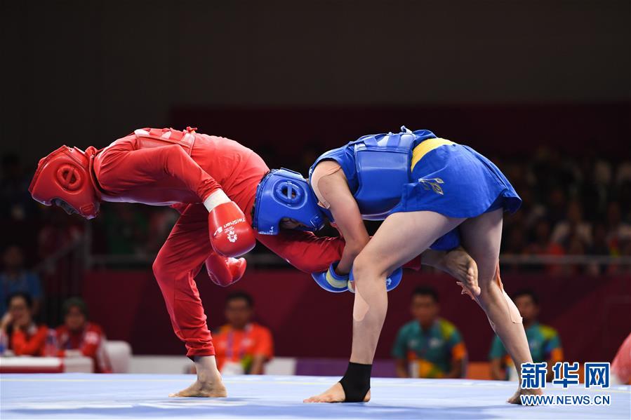 8月23日,中国选手蔡颖颖(右)在比赛中。 当日,在第18届亚运会女子散打60公斤以下级决赛中,中国选手蔡颖颖战胜伊朗选手莎赫尔巴努,获得冠军。 新华社记者张金加摄