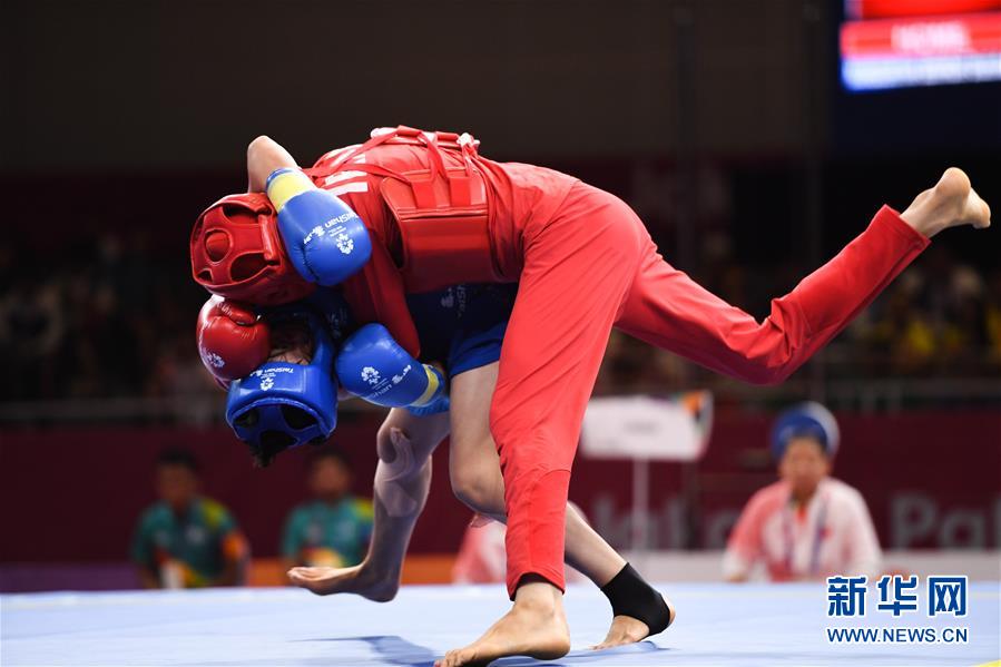 8月23日,中国选手蔡颖颖(下)在比赛中。 当日,在第18届亚运会女子散打60公斤以下级决赛中,中国选手蔡颖颖战胜伊朗选手莎赫尔巴努,获得冠军。 新华社记者张金加摄