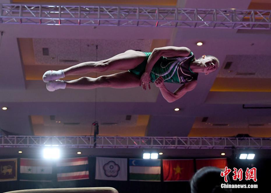 8月23日,雅加达亚运会体操女子跳马决赛,乌兹别克斯坦选手奥克萨娜·丘索维金娜以14.287分获得一枚银牌。现年43岁的丘索维金娜此前为了给患白血病的儿子筹款治病,曾代表不同国家多次参加体操世锦赛和奥运会,如今儿子已经康复,“体操妈妈”再次代表乌兹别克斯坦参加雅加达亚运会,继续其体操梦想。图为丘索维金娜飞跃跳马。中新社记者 侯宇 摄