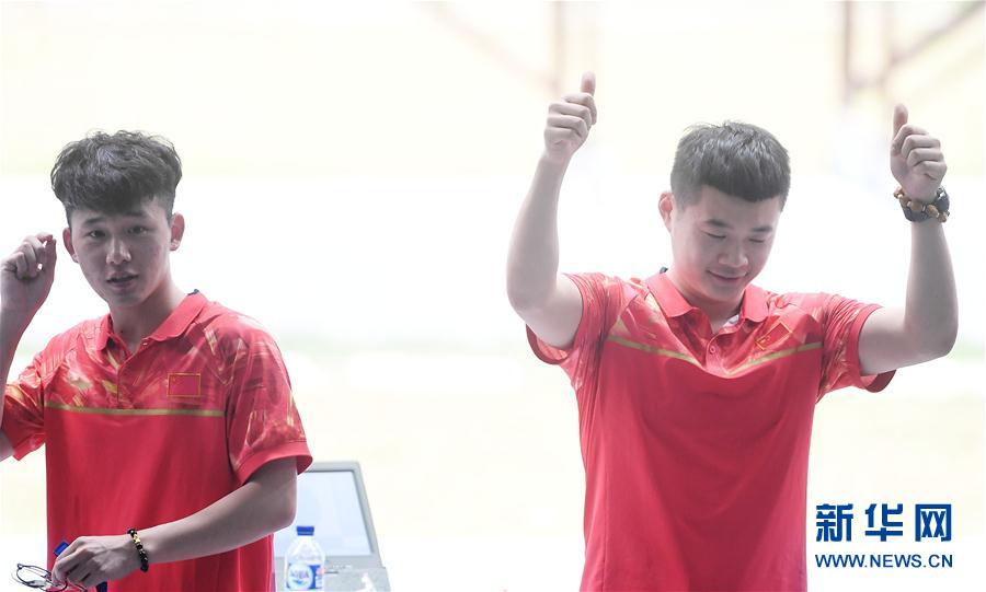 8月25日,中国选手姚兆楠(右)、林俊敏在比赛中。 当日,在印度尼西亚巨港举行的第18届亚运会男子25米手枪速射决赛中,中国选手姚兆楠、林俊敏包揽冠亚军。 新华社发(王申摄)