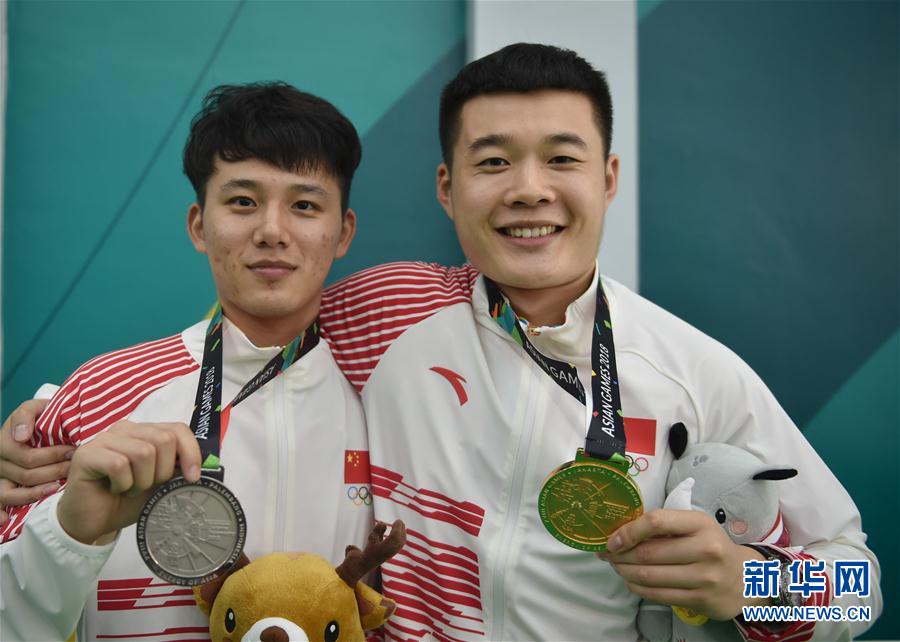 8月25日,中国选手姚兆楠(右)和林俊敏在颁奖仪式上。 当日,在第18届亚运会男子25米手枪速射决赛中,中国选手姚兆楠、林俊敏包揽金银牌。 新华社发(王申摄)
