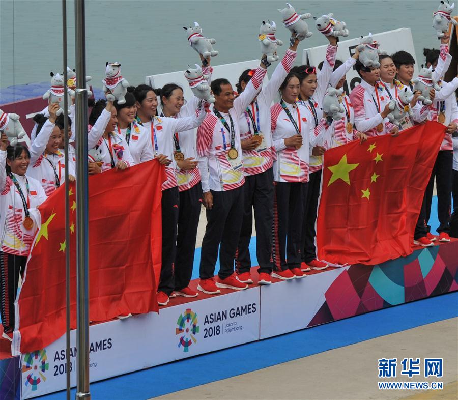 8月25日,中国队在颁奖仪式上。 当日,在印度尼西亚巨港举行的第18届亚运会女子200米龙舟竞速赛中,中国队获得金牌。印度尼西亚队和朝韩联队分获二、三名。 新华社发(维里摄)