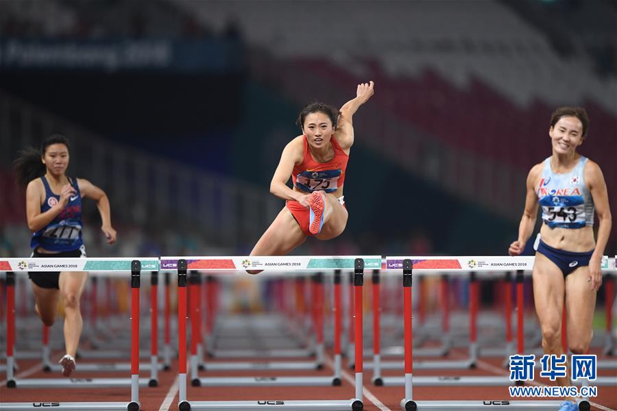 8月25日,中国选手王逗(中)在比赛中。 当日,在印度尼西亚雅加达举行的第18届亚运会田径女子100米栏预赛中,中国选手王逗以13秒58的成绩晋级。 新华社记者潘昱龙摄
