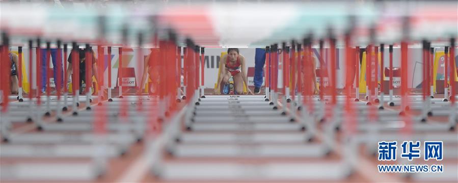 8月25日,中国选手王逗(中)在比赛前。 当日,在印度尼西亚雅加达举行的第18届亚运会田径女子100米栏预赛中,中国选手王逗以13秒58的成绩晋级。 新华社记者潘昱龙摄